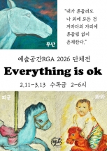 예술공간RGA 2026년 2월 전시 <Everything is ok> 안내입니다. '내가 흔들려도 나 외에 모든 건 저마다의 자리에 흔들림 없이 존재한다.' 어쩌면 자기만의 길을 가며 힘들어하는 이들에게 필요한 위로는You are ok 가 아니라 Everything is ok 가 아닐까? - 2026년 2월 11일 - 3월 13일 수 목 금 오후 2시 - 6시- 예술공간RGA (광주 동구 의재로 51번길 15-...