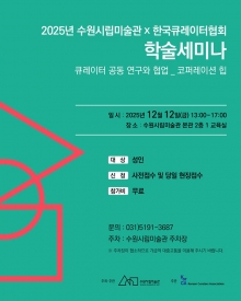 경기도 수원시립미술관(관장 남기민)은 한국큐레이터협회(회장 김재환)와 함께 2025년 학술 세미나 <큐레이터 공동 연구와 협업-코퍼레이션 힙>을 주제로 12월 12일(금) 오후 1시 수원시립미술관 행궁 본관에서 개최한다.