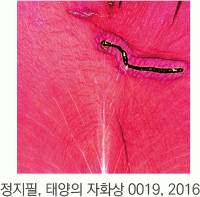 전정은이 실재하는 ‘흔적’의 파편들을 종합하여 일련의 매우 정교한 작업과정을 거쳐 인간 본성의 일면을 은유적으로 드러낸다면, 정지필은 사진의 어원은 ‘빛으로 그린 그림’이라는 지점에서 꼬리에 꼬리를 물고 이어지는 질문들에 대한 답을 집요하게 ‘추적’해간다. ‘본다’는 것은 언제나 사물에 빛이 반사된 물리적 현상이고, 그 빛의 근원은 태양이다. 즉 지구의 모든 현상은 태양으로부터의 빛(photo-)에 의해 그려지는(-graphy) 하나의 거대한 사진인 셈이다. 정지필의 <태양의 자화상>(2016)은 필름 대신 나뭇잎이나 해조류 등을 넣고 짧게는 1초에서 길게는 일주일에 걸쳐 태양의 모습을 찍어낸 작업인데, 이를 통해 그는 ‘봄(seeing)’을 가능하게 하는 근원인 태양 자체의 지속적인 변화를 보여줌으로써 우리가 지각하는 세계와 그에 대한 우리의 인식도 늘 가변적일 수 밖에 없다는 사실을 상기시킨다. <더 뜨거운 태양>(2019)은 ‘태양의 온도가 지금과 달랐다면 어떤 모습이었을까?’라는 물음에서 비롯되었는데, NASA가 위성으로 촬영한 실제 태양 사진에 태양의 온도가 현재보다 더 뜨겁거나 차가울 때의 모습을 포토샵을 이용해 상상으로 재구성한 작업이다. 2020년의 <더 뜨거운 태양-스펙트라> 연작은 다수의 태양이 동시에 존재할 경우를 가정한 초상 사진으로 가상의 태양에 해당하는 다수의 인공 조명들이 만들어내는 색의 변화에 따라 개개의 인물들의 모습이 시시각각 교차하는 다채로운 스펙트럼을 만들어 낸다.