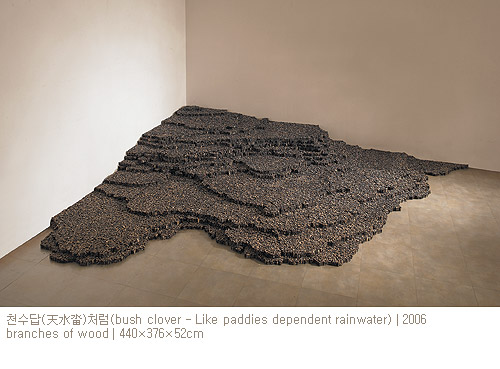 ‘나뭇가지 작업’에 대한 또 다른 관점으로서는, 나무라는 재료가 지닌 물성을 부각시키는 작업으로 이해하는 관점이 있을 수 있다. 사실 무수하게 쌓여 있는 싸리나뭇가지들의 단면들을 가까이서 응시하다 보면 잠시 그러한 ‘물성의 미학’에 몰입되어버리는 우리 자신을 발견할 수 있다.