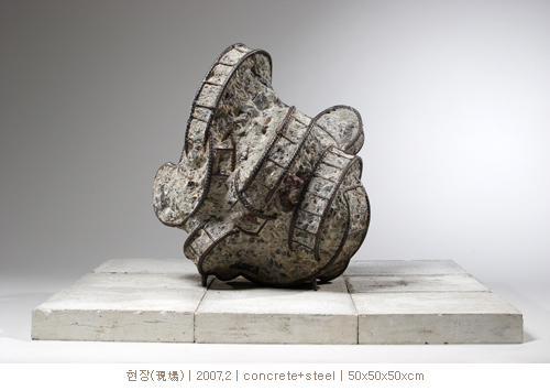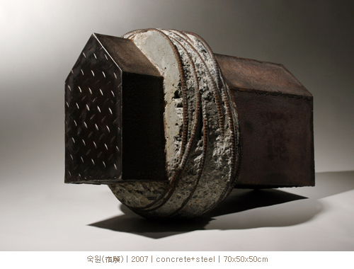이 일련의 조형물들은 삶의 처소가 갖는 서정적이고 의미론적인 성질을 환기시켜준다. 즉 작가의 작업에서의 집 형상은 단순한 재현의 소산이 아니라, 그 최소한의 골격과 살(시멘트를 갤 때 함께 집어넣은 잡석이나 이를 털어 낼 때 생긴 비정형의 흠집 등이 그대로 드러나 보이는)로써 집의 비가시적이고 비물질적인 성질을 암시하고 상징한 것이다. 작가의 전작에서도 확인되는 바이지만 사각이나 이를 변주한 집 형상은 일종의 이중적인 의미를 함축하고 있다. 즉 그 자체 가장 완전하고 안정적인 형태를 의미하면서도 이와 동시에 그 폐쇄적인 형태가 자신에게 함몰된 자기 정체성의 한계를 상징한다. 집을 (집단적이거나 개인적인) 정체성과 동일시하는 일반적인 상징문법에 기대어 자기 개인의 이야기(개인적인 서사)를 풀어내고 있는 것이다. 이처럼 거푸집으로부터 집 형상을 끄집어내는 작가의 행위는 집으로 상징되는 잠재적인 자아(내면적이고 무의식적인 자아)와 대면하는 경험에로 유도한다는 점에서 작가 개인의 경계를 넘어 보편성을 획득한다.