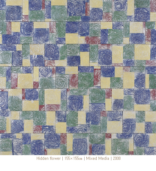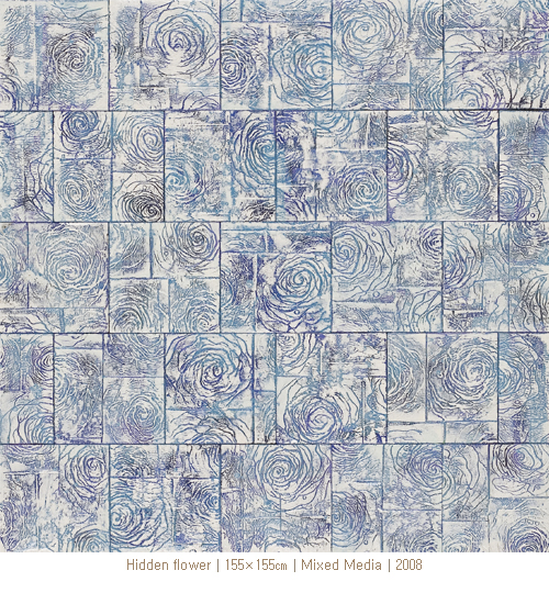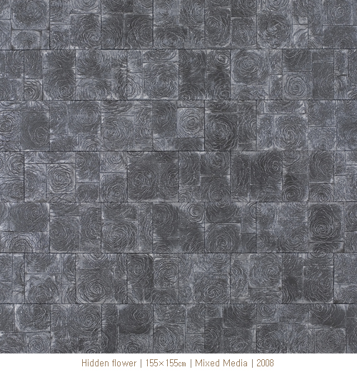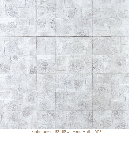 그 심원한 장미의 이미지는 반복되는 행위의 연속성에 의해 만들어진다. 소용돌이 구조의 선조가 반복되면서 신체적인 리듬이 개입된다. 물론 그 신체적인 리듬을 이끌어가는 것은 행위와 더불어 집중되는 정신성이다. 장미꽃의 경우 뾰족한 도구를 이용해 마르지 않은 물감 위에 드로잉의 방법으로 선을 그어 음각 형태의 이미지를 그리게 된다. 여기에서 장미꽃의 이미지는 실제와는 다른 소용돌이 모양의 이미지가 된다. 장미꽃의 형태와 비슷하면서도 실질적으로는 소용돌이 이미지가 되는 것이다.