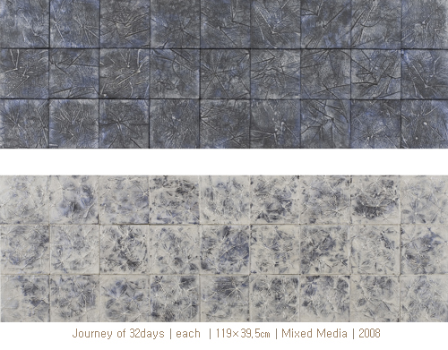 현상계의 물체 혹은 물질의 가치를 부정하는 듯 단색조로 제한하는 것은 시각적인 이해를 넘어서는 관념의 세계와의 조우를 기대하는 일이다. 어쩌면 유사한 이미지, 그리고 동일한 색상 및 크기의 패널을 연속적으로 붙여나가는 행위 자체는 지극히 단조롭고 무의미해 보일 수 있다. 하지만 그 행위의 연속성 이면에는 심미적인 세계가 존재한다. 수십 개 혹은 수백 개의 패널이 연결감을 가질 때 그처럼 단순한 최소 단위의 구조물은 전혀 새로운 조형개념으로 탈바꿈한다. 나열한다는 것은 새로운 조형적인 질서 및 리듬을 촉발하기에 그렇다.