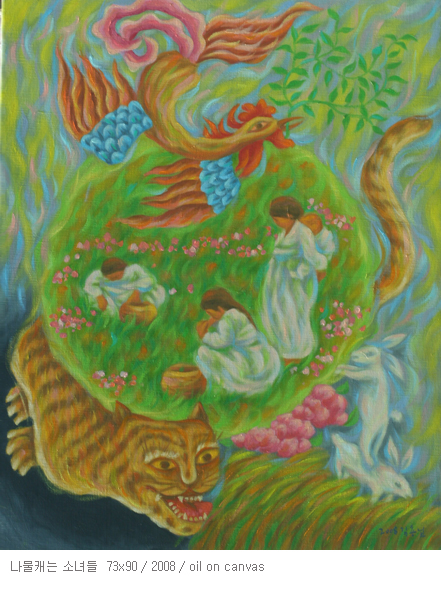 그녀가 고구려벽화를 발견한 것은 그 드림타임의 시간으로 푹 빠져 들어간 뒤이다. 그곳에서 그녀는 춤추는 산이며, 까마귀들이 앉아있는 신단수, 해님과 달님, 삼족오, 소머리를 한 신농씨 등을 만났다. 그리고 새로운 힐링의 힘을 발견한다. 그렇게 그녀가 지향하는 신화적 공간은 우리 조상들의 숨결과 맞닿아있다.