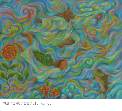 1990년대초부터 환경과 여성을 주제로 그림을 그리던 그녀는 90년대말 강화도 고향으로 내려갔다. 그리고 수년동안의 칩거를 끝내고 2007년부터 폭발적인 힘으로 갯벌 시리즈를 내놓고 있다. 왜 갯벌인가! 그곳에서 그녀의 여정의 비밀을 풀어줄 드림타임(Dreamtime)의 신화적 공간을 발견했기 때문이다. 그녀의 그림 속에 등장하는 찬란한 노을은 지는 해의 석양빛이 아니다. 그것은 태초에 우주를 창조하고, 지구를 만들고, 생명을 창조하던 시원의 빛의 색깔이다.