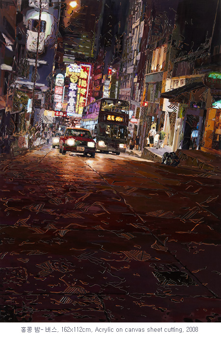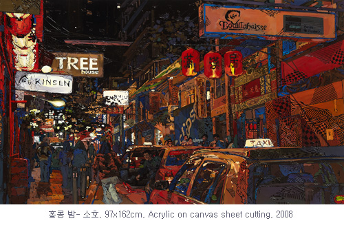 3. 회화의 재현과 빛작가 박상희의 작품은 재현과 평면 사이에서 행해지는 끊임없는 실험으로 볼 수 있다. 그리고 오려짐의 실험이 조각적 요철을 가짐과 동시에 일종의 패턴처럼 추상성을 가진다는 점에 더욱 의미가 있다. 재현과 추상적 패턴이 만나면서 하나의 회화적 이미지를 생산해낸다. 그러한 회화적 재현을 가능케 하는 것이 바로 빛이다. 박상희는 이제 화면을 구성하는 빛에 대해 관심을 가진다. 그녀의 최근작은 도시의 밤 풍경이 주를 이룬다. 그리고 그 밤 풍경엔 빛이 있다. 물론 그 빛은 도시의 가로등과 자동차, 건물의 간판들에서 뿜어져 나오는 인공적인 빛이다. 그녀에게 도시의 불빛은 간판처럼 연구해야 할 새로운 과제이다. 왜냐하면 그 빛은 소실원근법을 가능하게 하는 태양의 강렬한 빛과 구분되는 정서적인 빛이기 때문이다. 인공적인 빛은 각각이 가지는 색상과 조도를 가진다. 그리고 빛의 색상 및 강도는 그 도시문화를 대변한다. 작가 박상희의 ‘일상성’은 밤을 밝히는 인공적인 빛과 그 빛을 받아들이는 도시풍경으로 옮겨진다. 또한 그녀가 오랫동안 관찰하였던 한국의 일상성을 벗어나 다른 나라의 도시풍경을 화폭에 담는다. 그녀가 말하듯 인공적인 빛에는 그 빛을 해석하는 문화적 정서가 담겨져 있다. 그 빛은 한국의 간판문화처럼 민족성과 문화를 파악할 수 있는 척도로 사용될 수 있다.