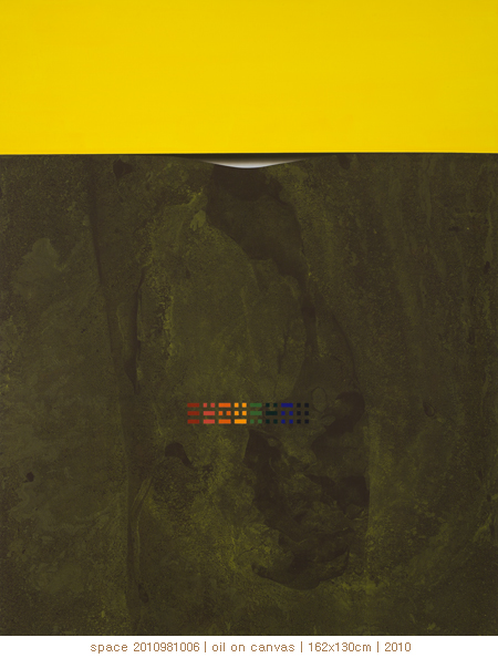 Geometric patterns are made up of circles and small units of signs. Simple and clean. In the meantime, an 'organic' atmosphere of creation covers the whole surface even covering up the inorganic patterns with even more stronger visual illusion. Repetitive use of circles, colors squeezed out from the surface, or small lines arranged with an order on simply structured planes. All elements hold the rhythm of creation inside and melt into the overall harmonious sound of the painting. The color of small bands is unified into black but partly variations of it make differentiated faces filled with changes. The geometrical signs are from the Eight Trigrams for divination. The Eight Trigrams are symbols of Asian vision of the universe which is deeply rooted in Oriental mentality. As the diverse translations of the Trigrams were developed into various outlooks of the world, the symbol used in Lee's works has the potential to be interpreted in many ways. Sometimes the symbol appears as several groups of signs which fill the surface wholly or partly. I think it is not necessary to try to find "signifies" of them since the artist does not have intention to plant any philosophic inner aspects of the signs. They are no more than signs. Just signs. However, the development of them on surface creates a certain order, and this makes the painting rather more plentiful and 'free'. As a whole, there is an eternal development. Over it, there is the rhythm of creation created by small signs. The surface becomes alive like this. It achieves the real existence and its own "presentation".